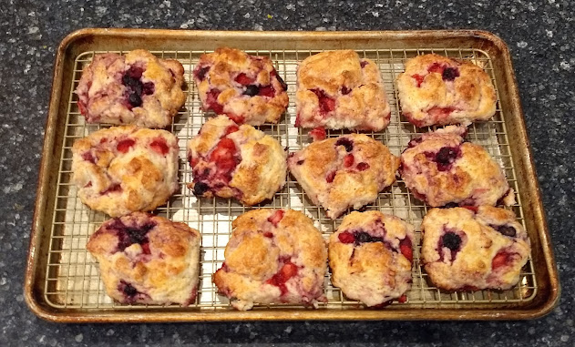 I wanted to make something quick this morning for Doug to take into the Property Committee Work day, and they were going to prune roses, so I wanted something with red. I made just-in-time Berry Scones!